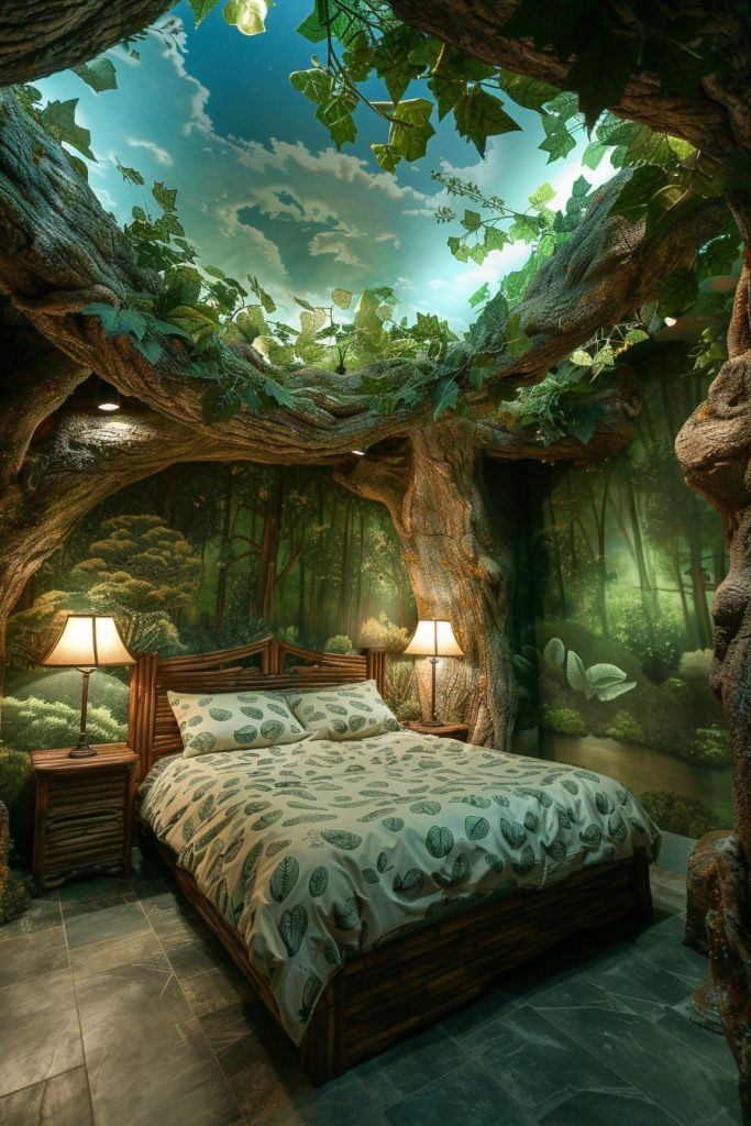 Rainforest Canopy Room bedrooms use a palette of deep greens and rich, earthy browns to mimic the dense, shaded foliage of a rainforest. The use of dark, tropical woods like teak and mahogany for the furniture adds to the natural, grounding feel. Overhead, a canopy bed draped with light, gauzy fabric simulates the protective forest canopy, adding an element of both intimacy and adventure. This bedroom style is ideal for nature lovers looking for a deep, restful, and enveloping retreat.