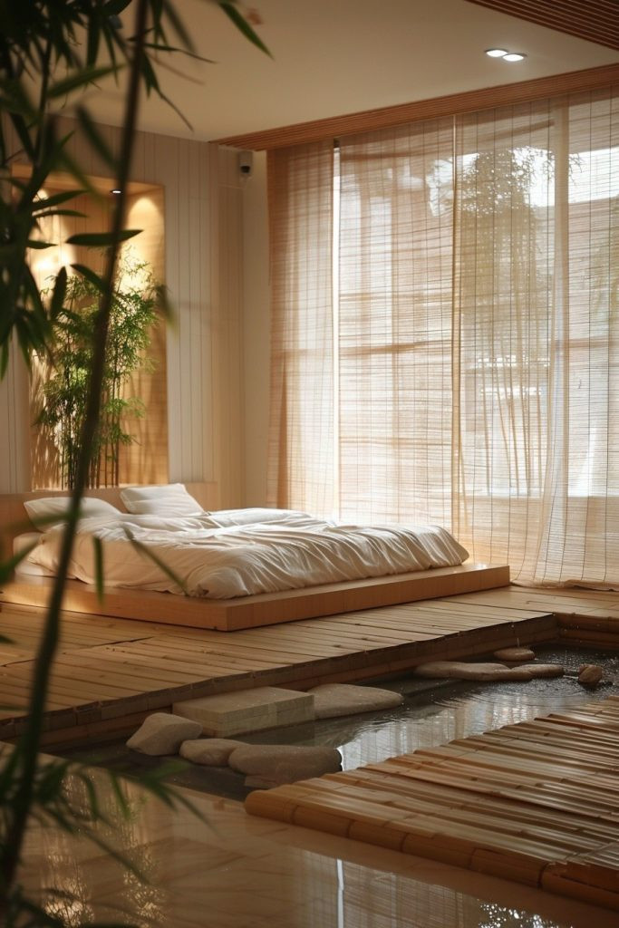 Tropical Zen Chamber bedrooms expertly blend the clean simplicity of Zen aesthetics with the warmth and organic feel of the tropics. A neutral color palette provides a calm, serene backdrop, while natural elements like dark stone, bamboo, and water features add texture and a sense of tranquility. Minimalistic, low-profile furniture and uncluttered spaces emphasize a peaceful retreat from the world, creating a sanctuary for meditation and deep relaxation.
