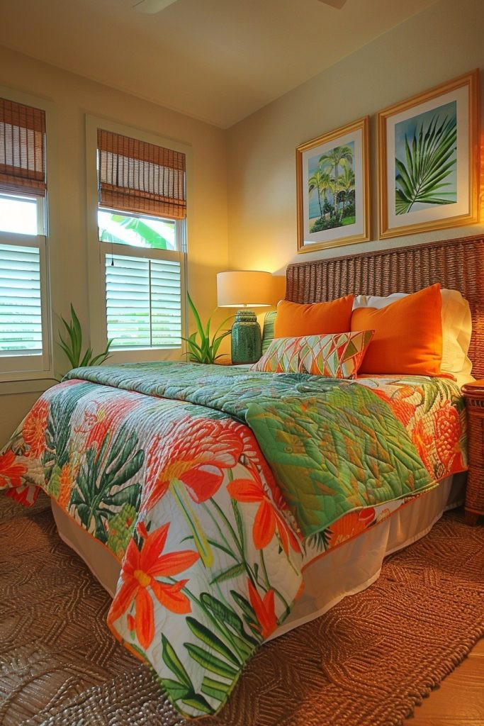 Tropical Paradise Escape bedrooms are designed to immerse you in a lush, vibrant environment with bold tropical prints and rich, natural materials. Dark, heavy wooden furniture, perhaps with carved details, creates a beautiful contrast with bright, floral or palm-leaf patterned bedding and vibrant wall art depicting tropical scenes. Large windows are key, allowing natural light to emphasize the bold colors and patterns typical of a tropical setting. This style is perfect for those who love a bold and energetic bedroom vibe.