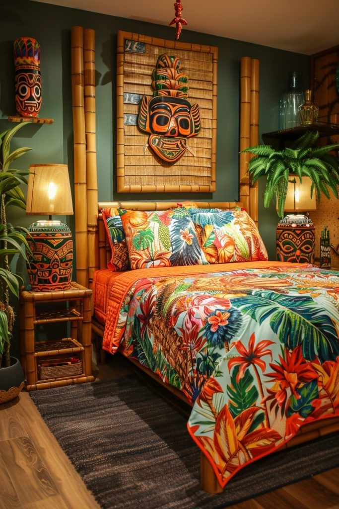 A Tiki Haven Bedroom incorporates Polynesian-inspired decor with materials like thatched roofing (perhaps on a headboard), bamboo furniture, and exotic wood carvings. Decorative tiki masks and bamboo elements contribute to a playful, island-party vibe. Vibrant, retro-style prints and colorful textiles add fun and energy to the room, making it feel like a perpetual luau. This style is perfect for those who enjoy a festive, fun, and exotic bedroom atmosphere.