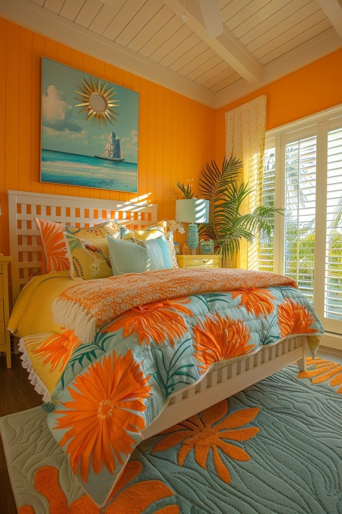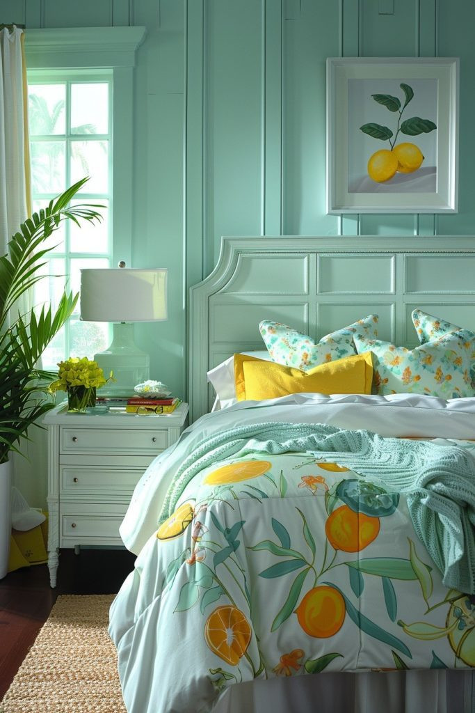 A Citrus and Sea Bedroom combines the fresh, zesty colors of citrus fruits with the soothing tones of the sea. Bright orange, lemon yellow, or lime green accents are used to energize the room, while a base of blues and greens brings balance and calm. This lively yet soothing combination is perfect for creating a cheerful, refreshing, and unique bedroom atmosphere that is full of personality and positive energy.